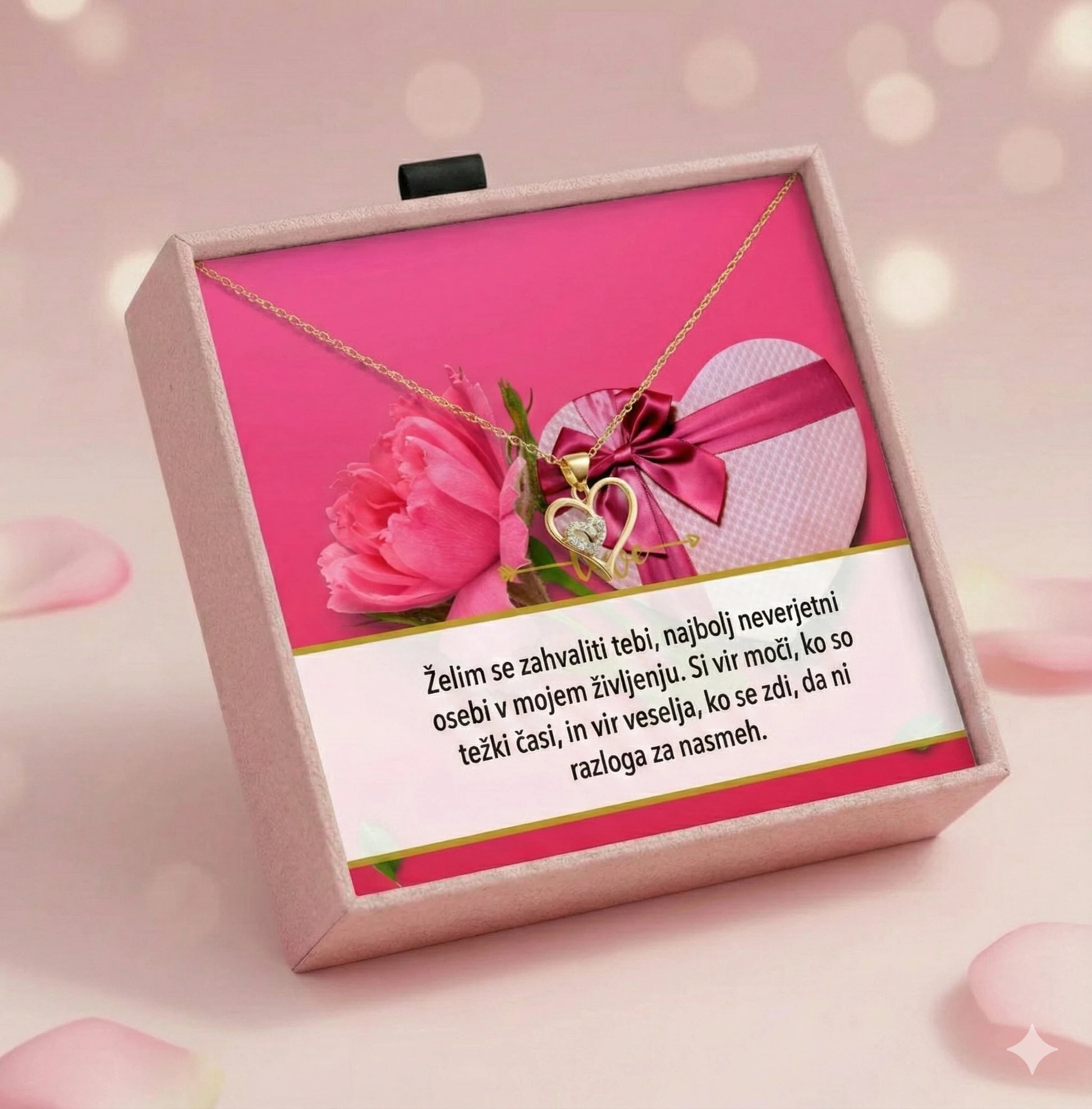 Izdelek je pakiran v lični darilni embalaži, kjer je vstavljeno izbrano posvetilo in verižica.